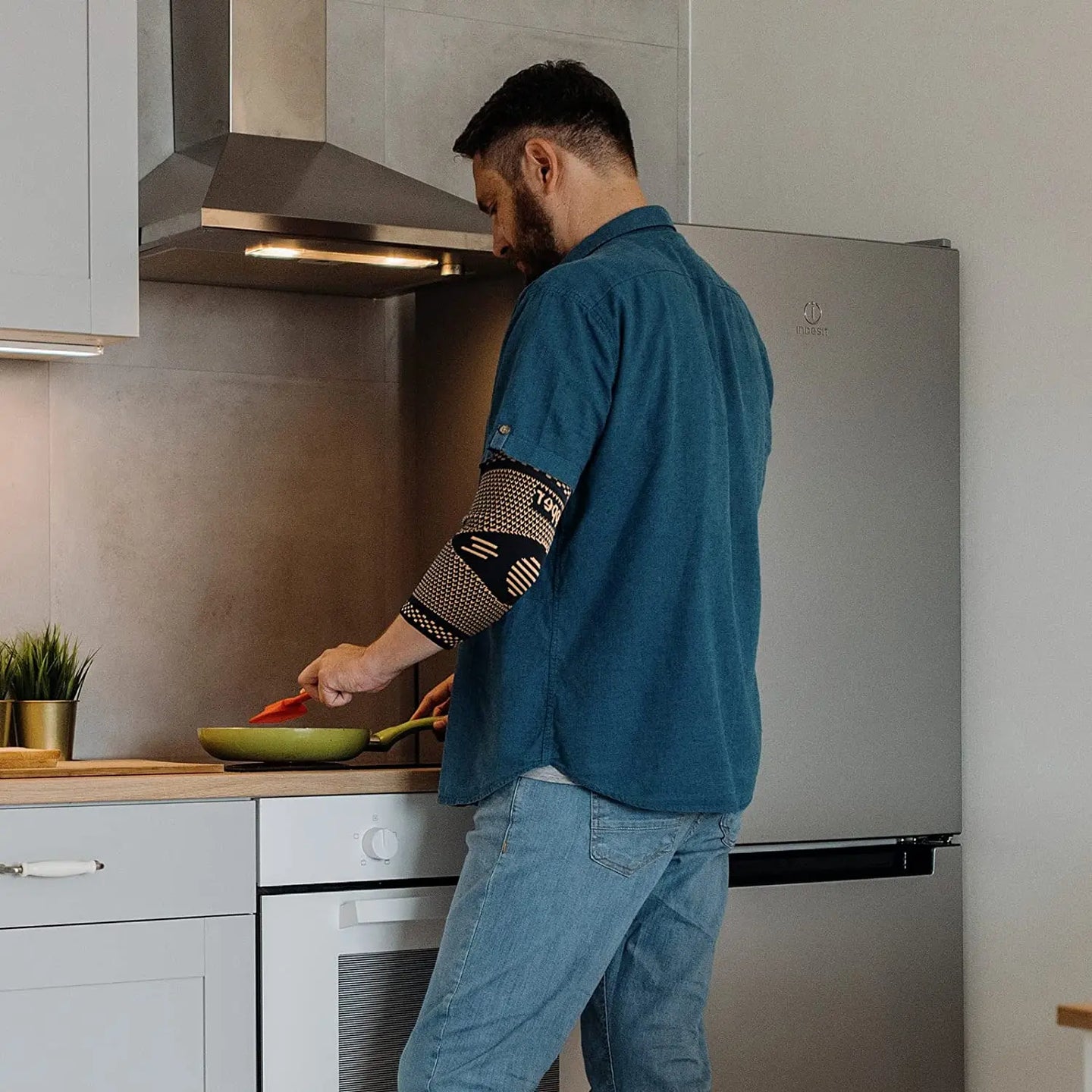 High-elastic, 3D knitted fabric wraps the elbow in a close, 360° fit. Pressure is distributed evenly instead of pressing on one sore spot, and side support is reinforced so the joint feels more stable and controlled. At the same time, the knit is breathable and moisture-wicking, allowing heat and sweat to escape. Your elbow stays gently insulated and warm, while the skin remains dry and comfortable.