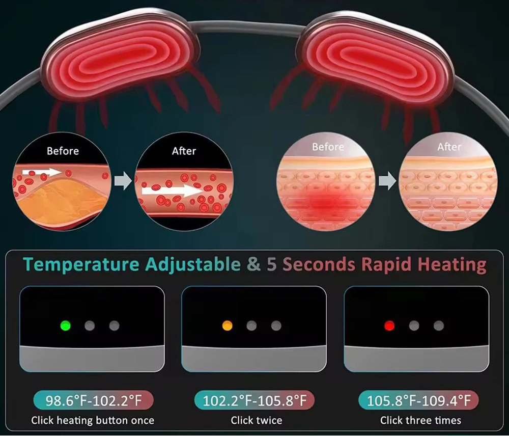 Heat therapy adds another level of benefit. Warming the neck in the therapeutic range shown in the images (about 98.6°F–109.4°F) helps dilate blood vessels, bring more oxygen to the tissues and soften tight connective tissue around the vertebrae. Warm muscles respond better to stretching and massage, so the combination of TENS and heat gives a powerful, medical-style “hot compress plus deep stimulation” effect.