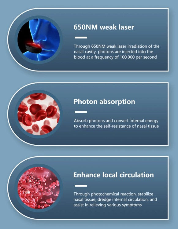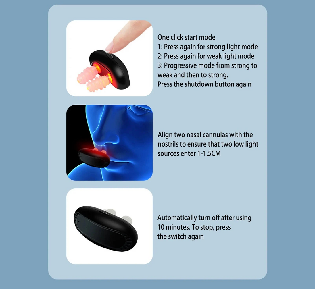 Advanced Red Light Therapy: Uses smart infrared red light technology to gently stimulate the nasal area, helping soothe irritation and support healthier nasal passages. This non-invasive approach is designed to improve comfort and promote better breathing without chemicals or harsh treatments.