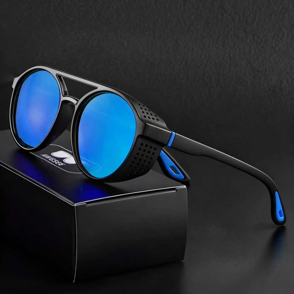 These sunglasses are designed to combine two styles into one functional build. The overall shape is inspired by sport eyewear: wide coverage, stable fit, and protection that wraps farther toward the sides. On top of that, the styling brings a retro/steampunk feel with a squared shield look and industrial edge lines.