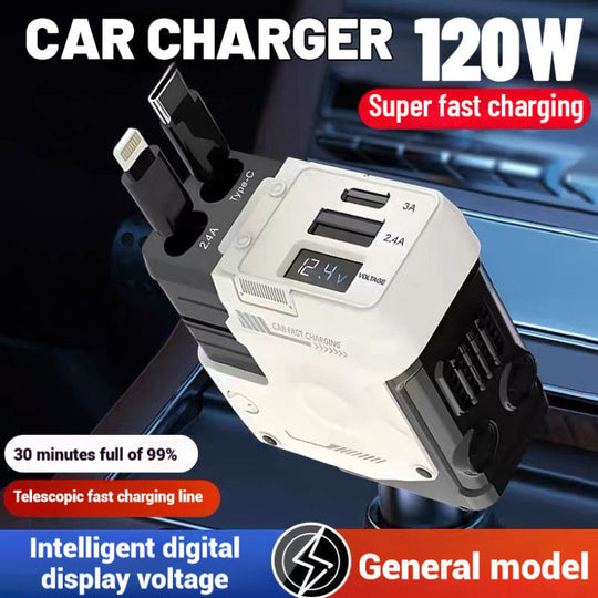 120W Super-Fast 4-in-1 Adjustable Retractable Car Charger with Digital Voltage Display