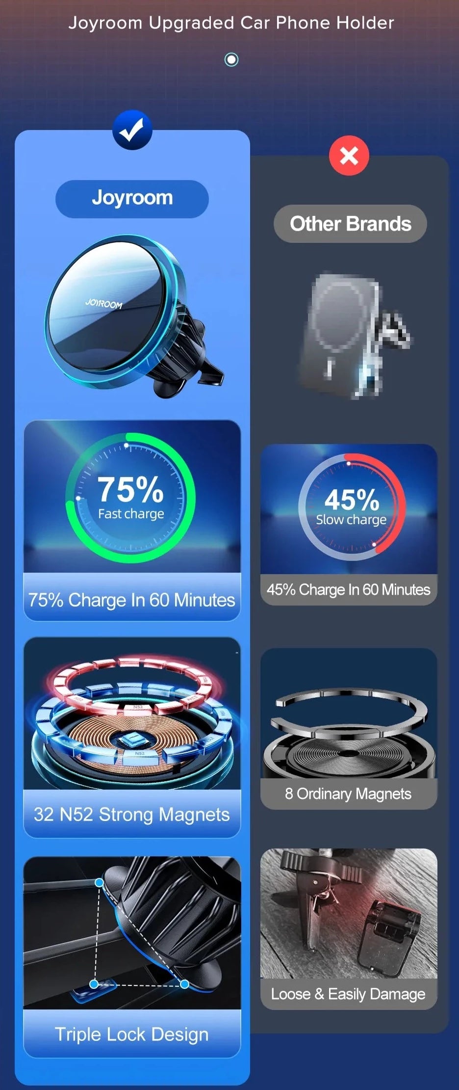 High Charging Efficiency: With a dual fast charging design featuring an all-copper coil and smart chip, this holder boosts charging efficiency by an impressive 150%. In just 60 minutes, you can achieve a 75% charge, ensuring you're always ready for the road ahead. The fast cooling chip prevents your phone from overheating during charging. Durable Construction: Made from high-quality stainless steel, the Joyroom Magnetic Car Phone Holder is built to last. It withstands the test of time, remaining durable and resistant to deformation. You can trust that it will serve you well for years to come.